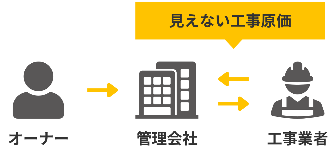 管理会社が元請け、工事業者が下請けになる構造で、やり取りがオーナーから見えず、ブラックボックス化しています。